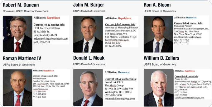 Sending a message to Postal Board Chairman Robert "Mike" Duncan is a waste of time since Trump appointed him to the Board but he also runs the GOP Senate Super Pac for Mitch McConnell. He also maneuvered to have an original National GOP Finance Committee member, Louis DeJoy, appointed as Postmaster General. All of the original Trump Finance folks are in jail except for DeJoy according to Maddow.